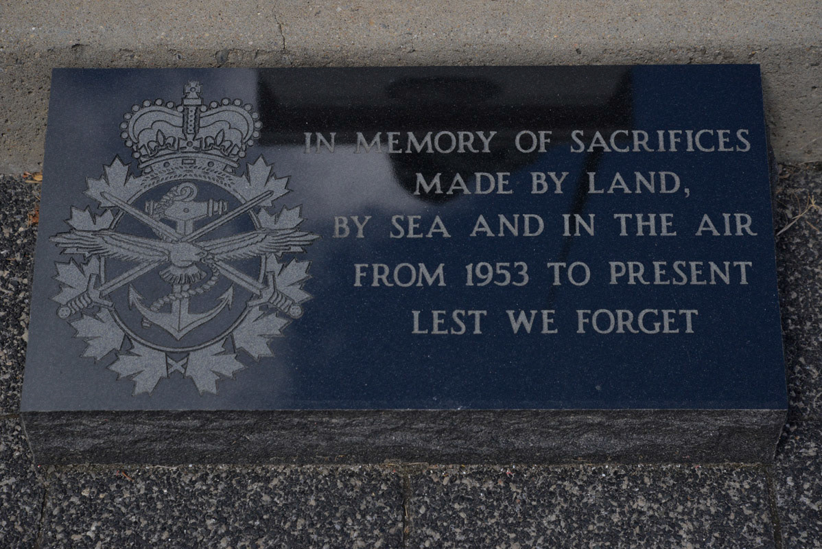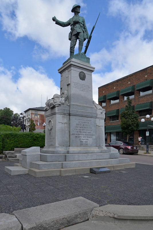 According to Heritage Brockville website the Brockville War Memorial Monument “was erected in 1924 in memory of those citizens of Brockville who died in the First World War. The granite base and shaft supports a bronze figure of a Canadian Infantryman in battle clothing grasping a rifle with fixed bayonet in his extended left arm while in the act of throwing a grenade with his right hand. The monument occupies a central position at the main crossroads of the City. Placed in Court House Avenue the monument was made by the sculptor Nicholas Piroton. The figure was cast by the Allis Chalmers Co. of Toronto. The Memorial was built and erected by McIntosh Granite Co. of Toronto”. These photos were taken in August 2022.